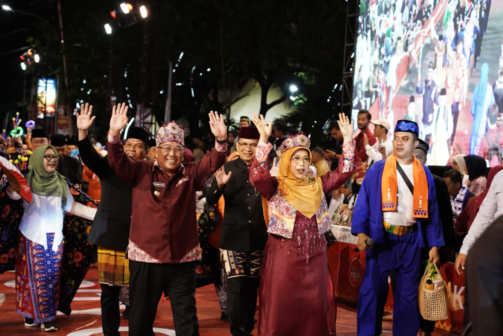Wali Kota Depok, Mohammad Idris didampingi Ketua Dewan Kerajinan Nasional Daerah (Dekranasda) Kota Depok, Bunda Elly Farida turut memeriahkan pawai bersama tim pawai Kota Depok.